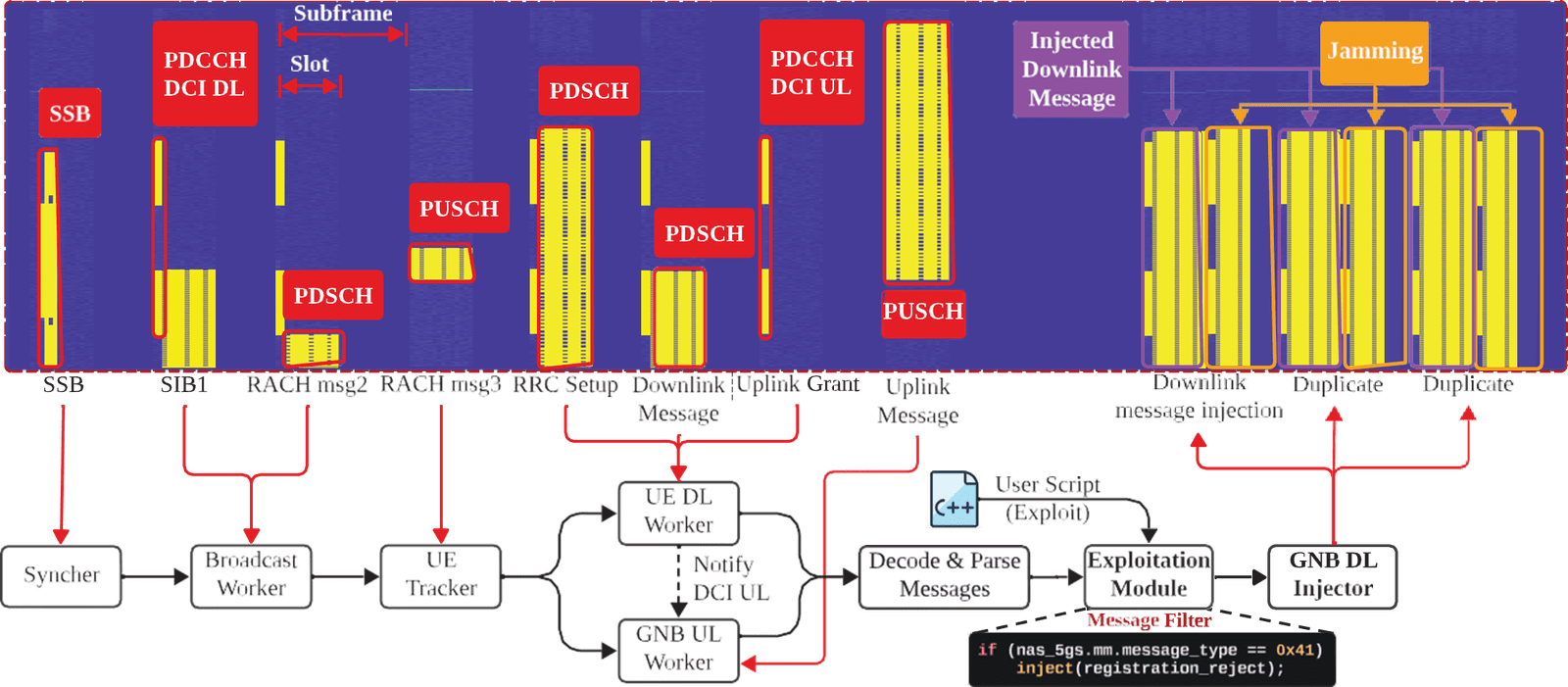 El Syncher alinea temporización y reparte subtramas. Broadcast Worker decodifica MIB/SIB1 y detecta nuevos UEs vía RACH. UE-Tracker coordina dos hilos: UE DL Worker (downlink) y gNB UL Worker (uplink con Timing Advance). Tras parsear y filtrar mensajes, el Exploitation Module decide el ataque y el gNB DL Injector codifica DCI y adjunta el payload al PDCCH/PDSCH para inyectarlo en el momento exacto.