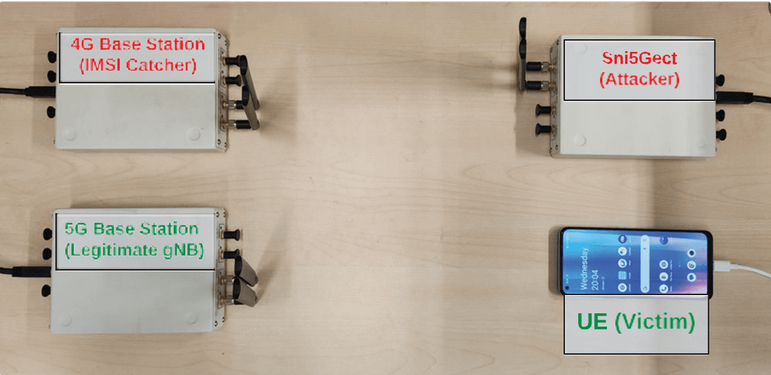 Montaje físico: gNB 5G legítima, eNB 4G (IMSI-catcher), SNI5GECT (atacante) y UE (víctima).