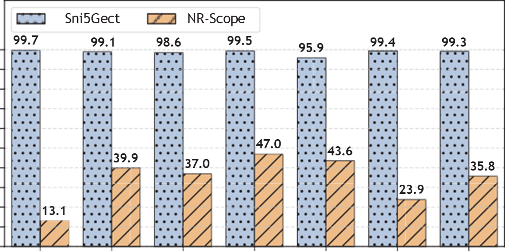 Capturar DCI con alta fiabilidad es crítico para sincronizar la inyección. Los resultados muestran que SNI5GECT mantiene una tasa cercana al 99% de forma repetida, superando claramente a NR-Scope. Esto estabiliza el pipeline (decodificación PDSCH/PUSCH) y aumenta la probabilidad de que el UE acepte los paquetes inyectados.
