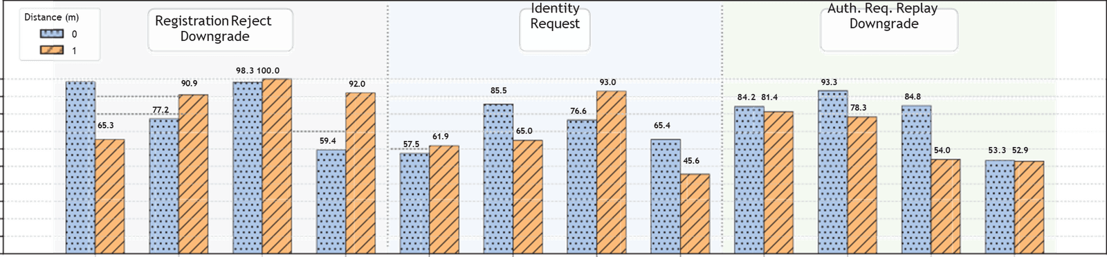 Éxito de ataques por tipo y distancia: Registration Reject (downgrade), Identity Request y Auth. Request Replay (downgrade). En la mayoría de modelos se observan tasas altas (≈60–100%), incluso a 1 m.